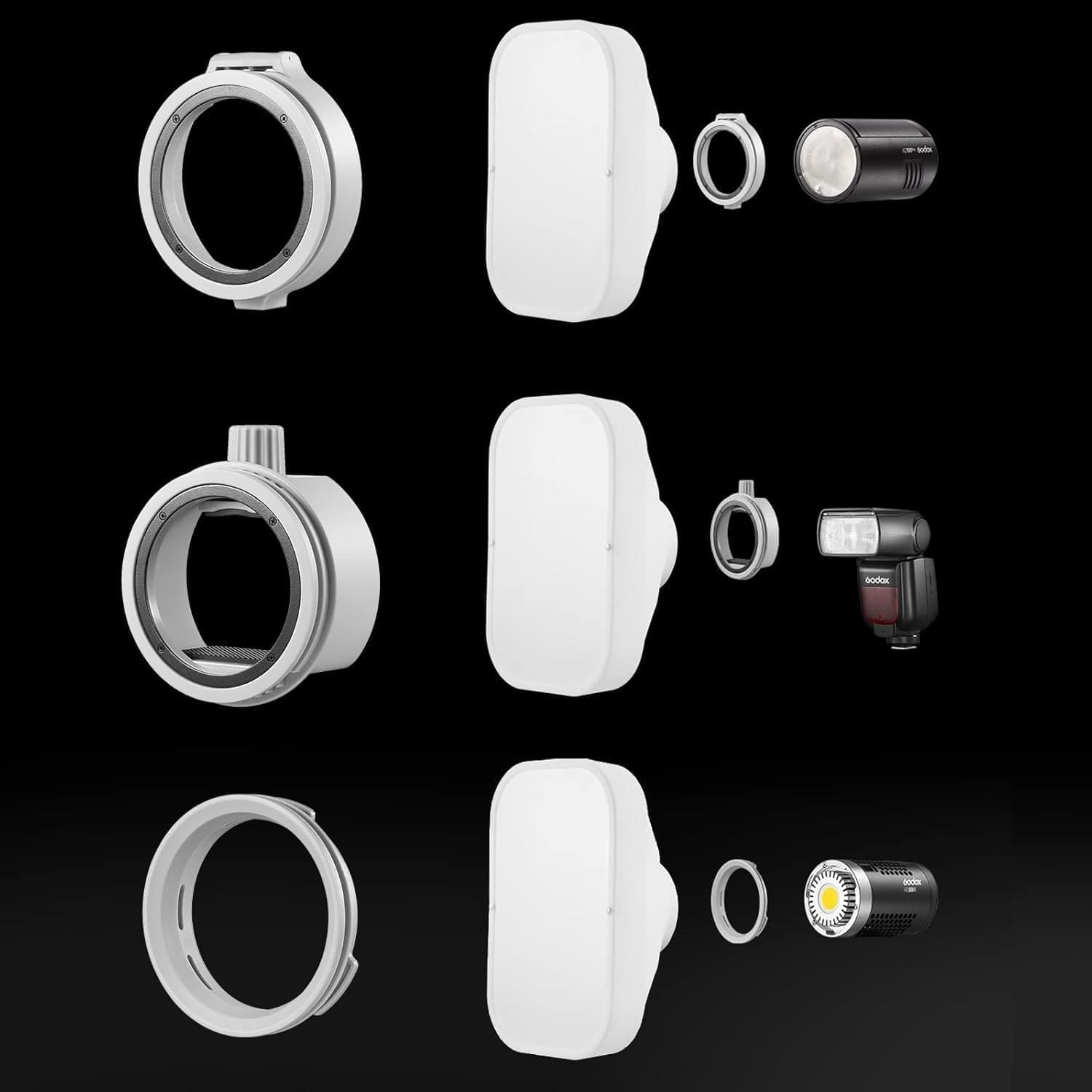 - Round Head Adapter – Designed for Godox round-head flashes like the V1 series, AD100Pro, and AD200Pro.