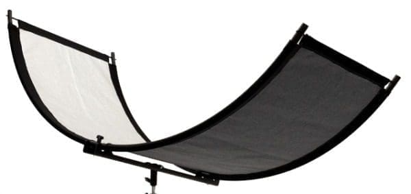 The H-EyE-Lighter Curved Reflector from FlashGear.net is a simple solution to a lighting problem. A common technique for achieving a glamorous portrait is lighting the subject on-axis from above to bring out the modeling of the face and details in the hair, makeup, etc. But what to do about the hard shadows under the nose and around the eyes other than add additional lights to complicate the subject? The H-EyE-Lighter’s  58.5″ wide modifier has an open “U” shape which forms an arc that surrounds the subject, over which reflective silver material is tightly stretched for a consistent effect.